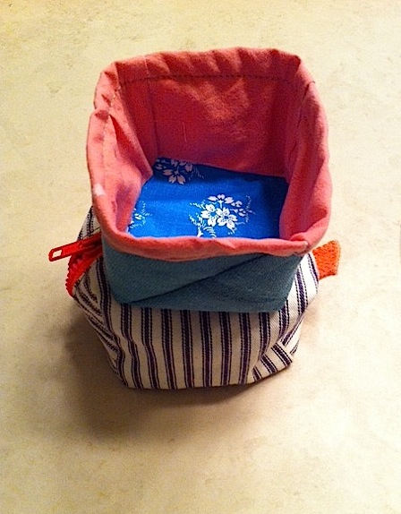 But in the name of dialing back the Q-tip box wierdness; I'm making these. Flickr user Hiromi W posted this nice little photo tutorial showing how to turn 4 narrow strips of fabric into a boxy basket. It's sturdy and is a very satisfying mini-project for using up long scraps. However lumpen my first wonky-top-stitched attempt… it is still a useful object, and there will be more made—each lined and topstitched more skilfully than the last. Yes!